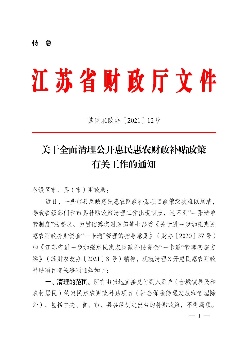 關(guān)于全面清理公開惠民惠農(nóng)財(cái)政補(bǔ)貼政策有關(guān)工作的通知