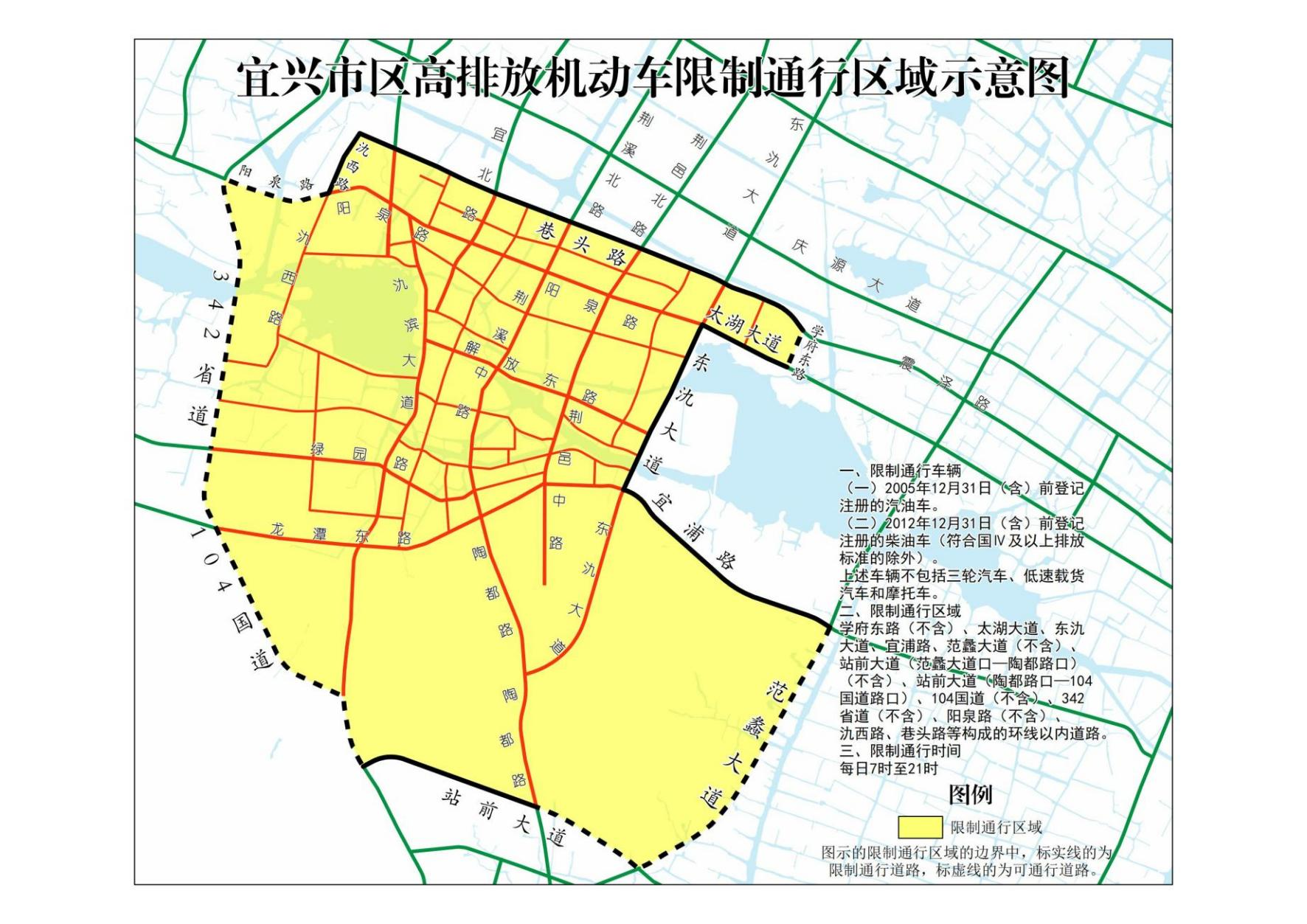 學府東路(不含)、太湖大道、東氿大道、宜浦路、范蠡大道(不含)、站前大道(范蠡大道口—陶都路口)(不含)、站前大道(陶都路口—104國道路口)、104國道(不含)、342省道(不含)、陽泉路(不含)、氿西路、巷頭路等構成的環(huán)線以內(nèi)道路。