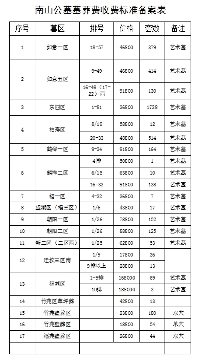 南山公墓墓葬費(fèi)收費(fèi)標(biāo)準(zhǔn)備案表