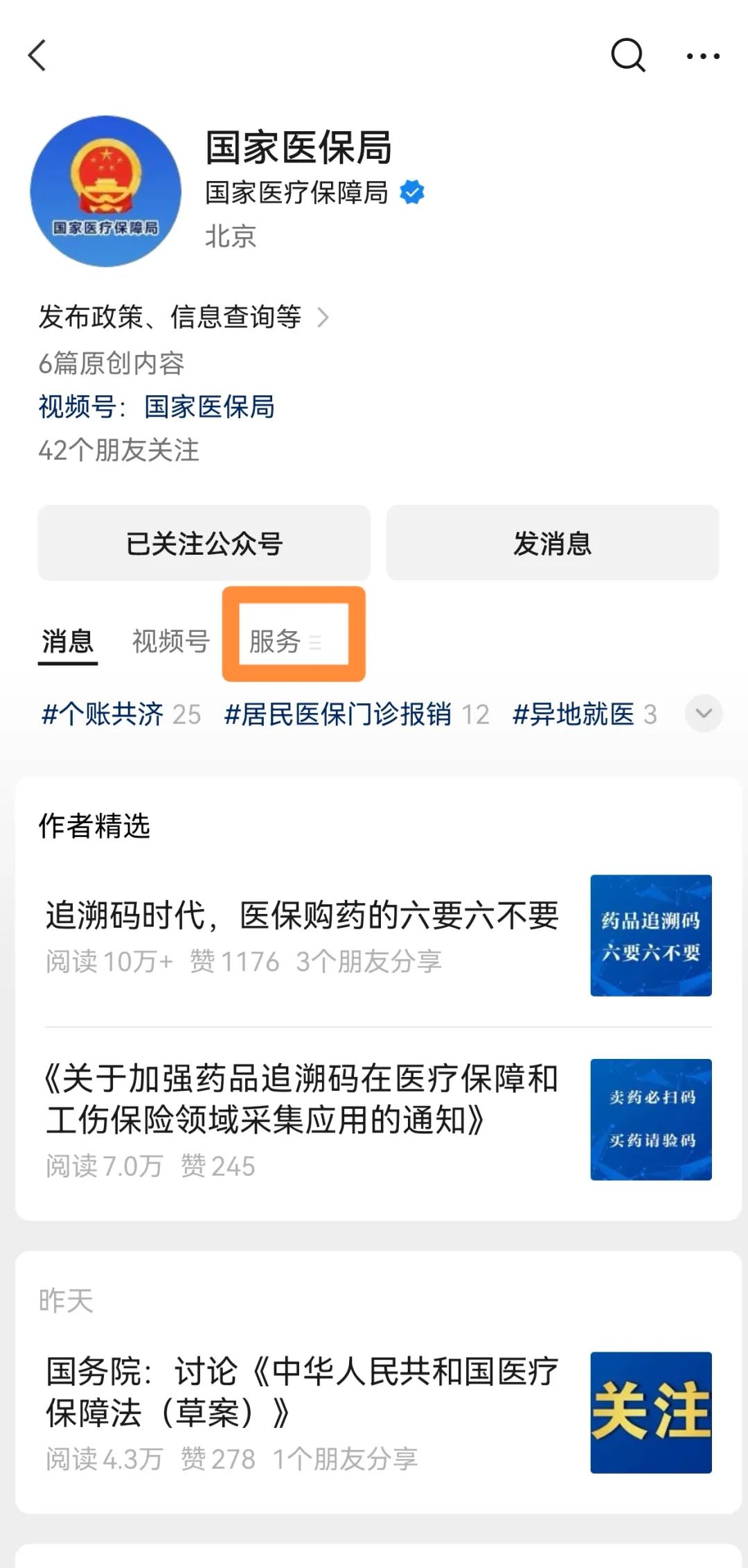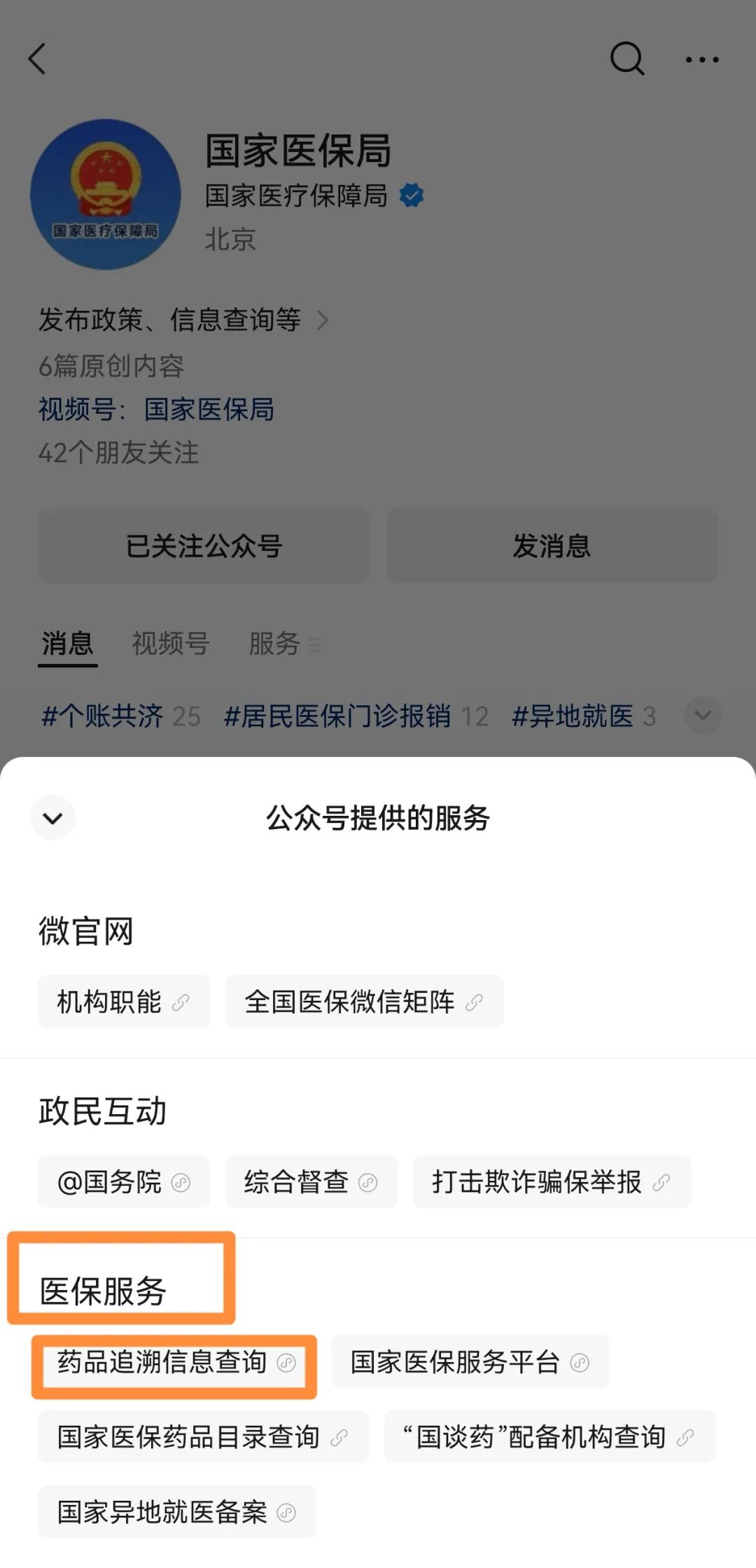 2.通過“國家醫(yī)保局”微信公眾號,點擊“醫(yī)保服務”,會有一個“國家醫(yī)保服務平臺”,點開“藥品追溯信息查詢”模塊,也可以實現掃碼查詢或者輸號查詢。