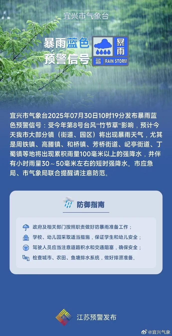 受今年第8號臺風“竹節(jié)草”影響,預計今天我市大部分鎮(zhèn)(園區(qū)、街道)將出現(xiàn)暴雨天氣,尤其是周鐵鎮(zhèn)、高塍鎮(zhèn)、和橋鎮(zhèn)、芳橋街道、屺亭街道、丁蜀鎮(zhèn)等地將出現(xiàn)累積雨量100毫米以上的強降水,并伴有小時雨量30~50毫米左右的短時強降水。市應急局、市氣象局聯(lián)合提醒請注意防范。