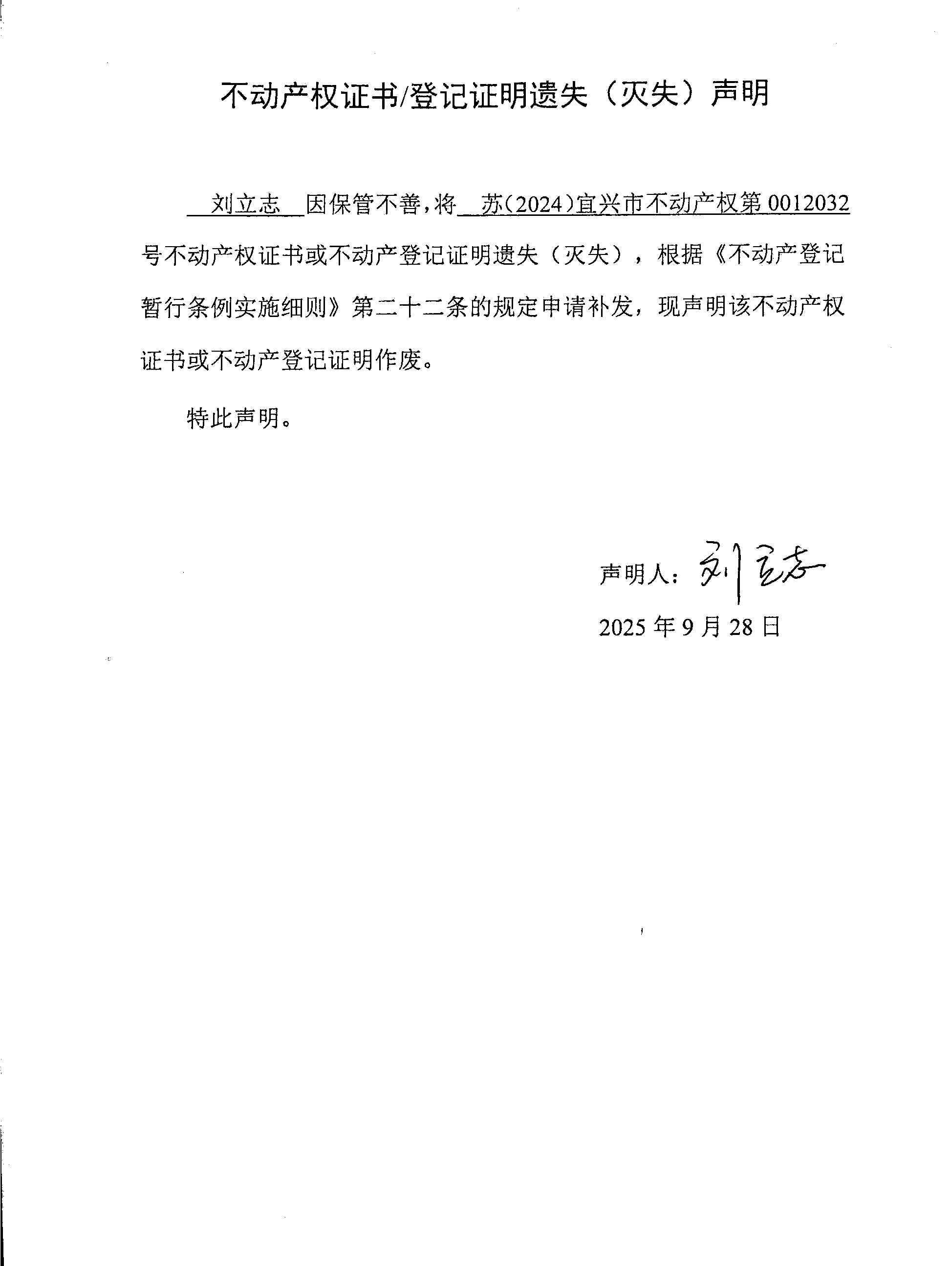 劉立志不動產(chǎn)權(quán)證書遺失聲明