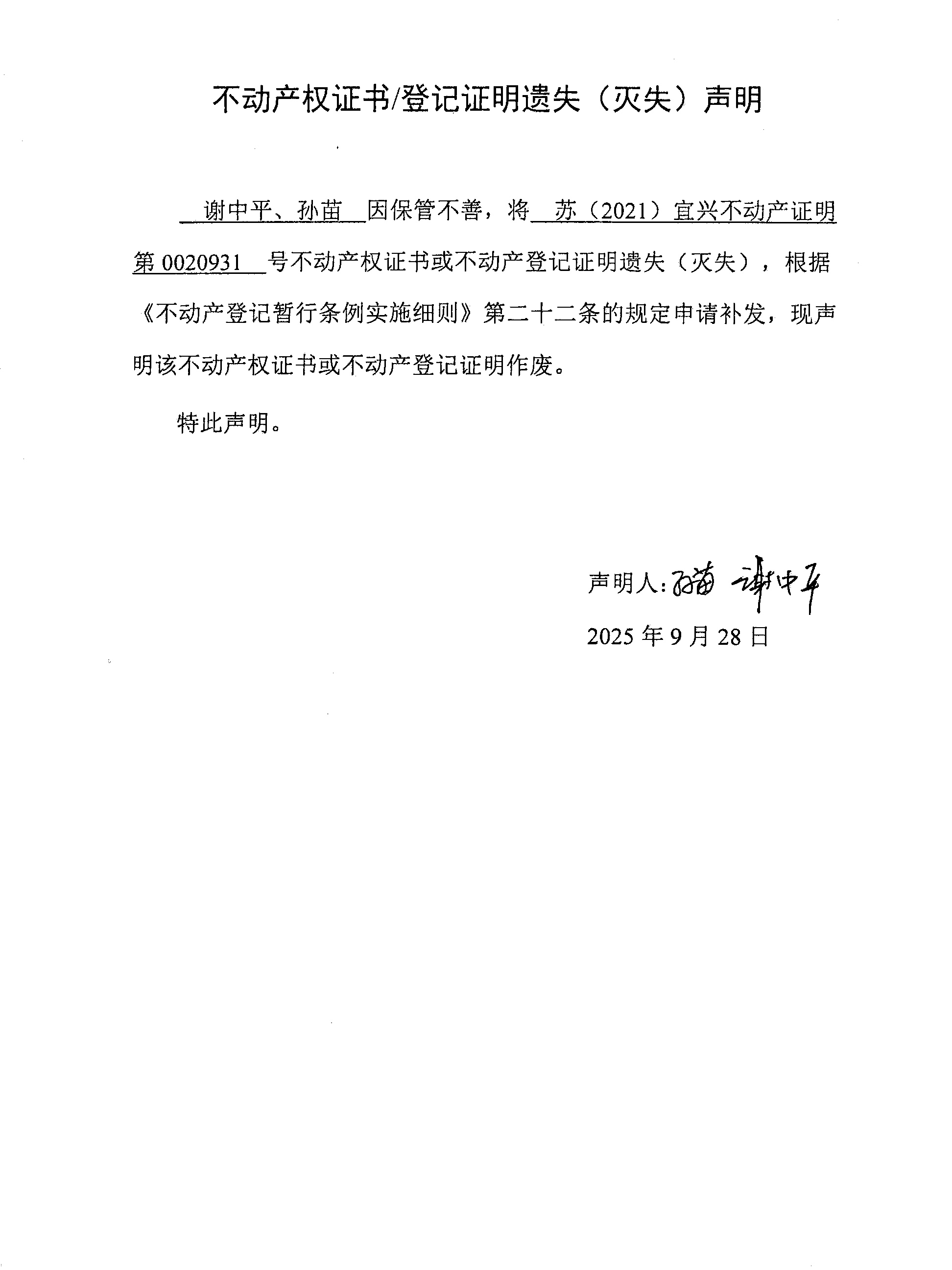 謝中平、孫苗不動(dòng)產(chǎn)預(yù)告登記證遺失聲明