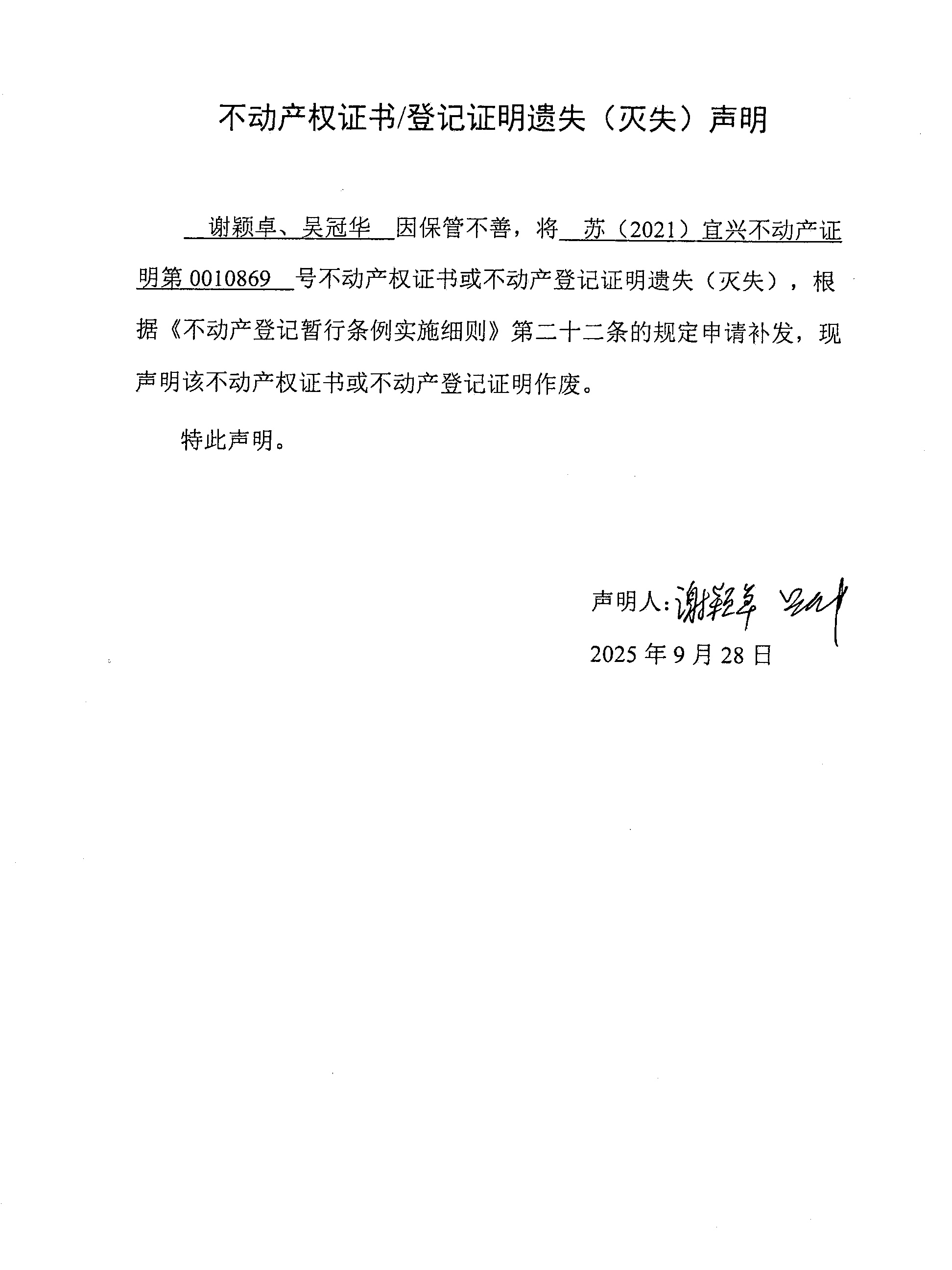 謝穎卓、吳冠華不動(dòng)產(chǎn)預(yù)告登記證遺失聲明